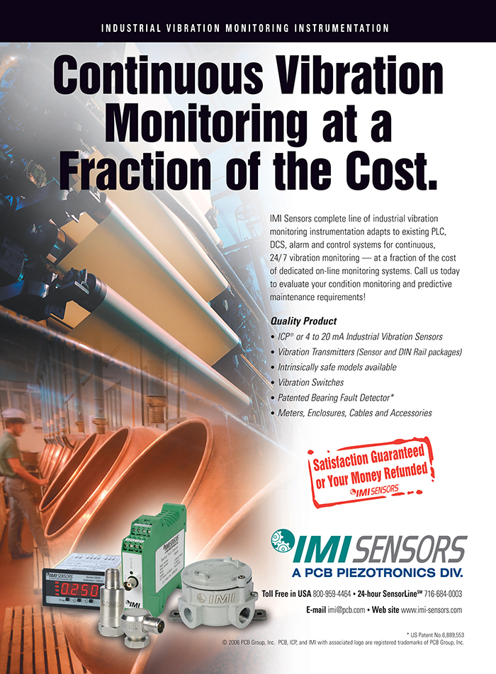 IMI Sensors industrial noise monitoring instrumentation ad: “Continuous VibrationMonitoring at aFraction of the Cost.”